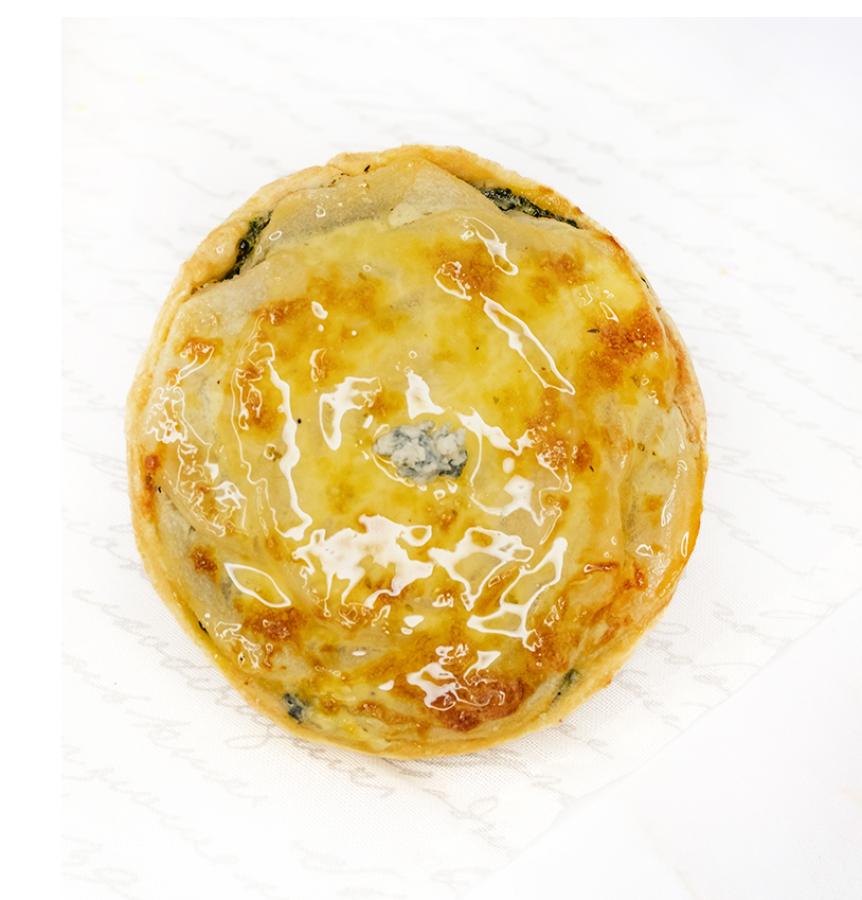 Tarta de espinaca, queso azul y peras individual
